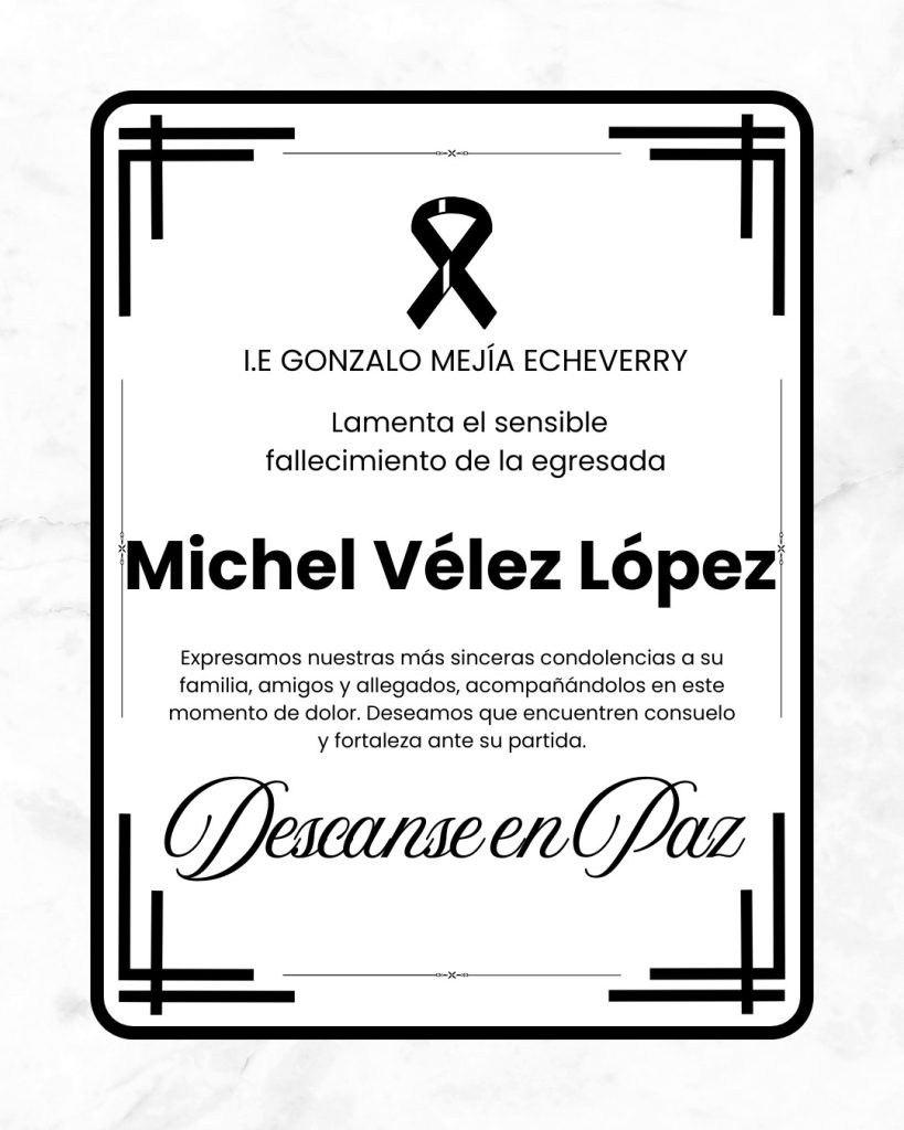 La Institución Educativa Gonzalo Mejía Echeverry lamenta profundamente el fallecimiento de Michel Vélez López, egresada de nuestra institución.